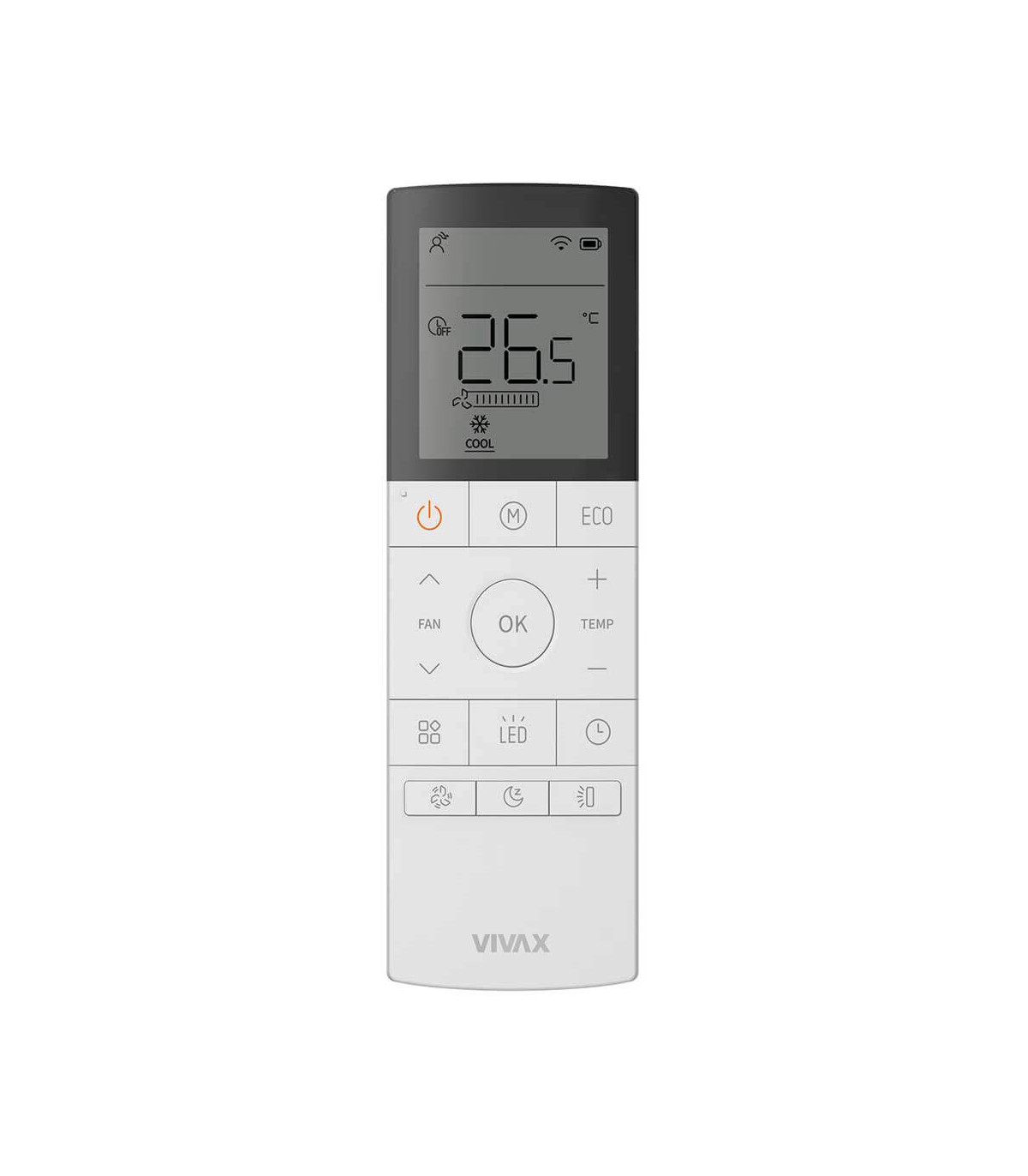 Bazat pe modele naturale și pe principii bionice, designul paletei ventilatorului VIVAX reduce în mod eficient rezistența la fluxul de aer și zgomotul. Împreună cu gura de refulare optimizată, oferă același volum de flux de aer cu un consum de energie cu 30 % mai mic. - Panoul de control al inverterului