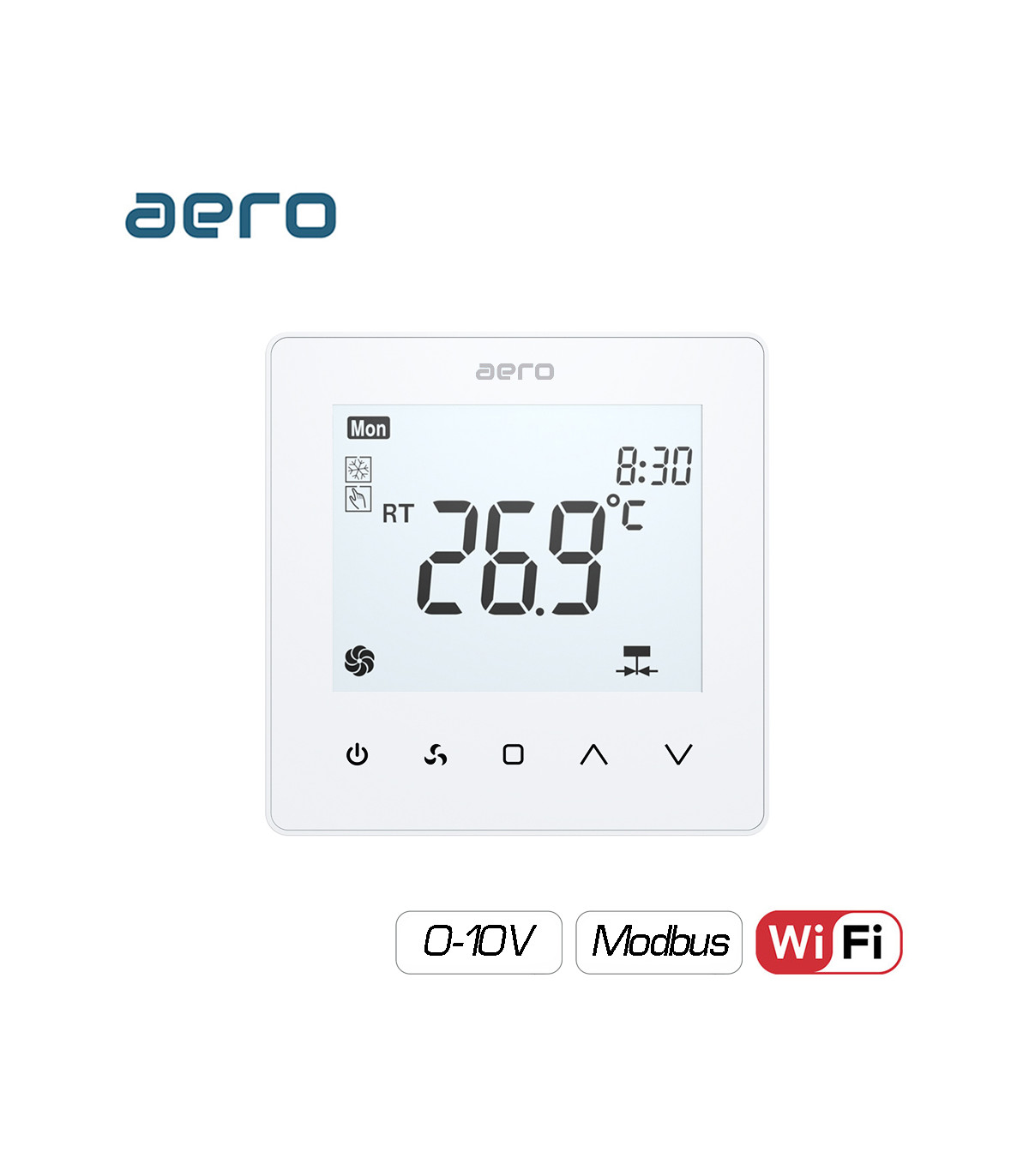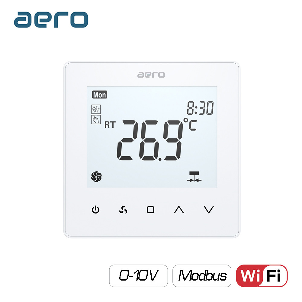 Termostat AERO TP518FC4WN-FV White, pentru Ventiloconvector, Aeroterma, 2/4 tevi, WiFi, Modbus, Ventilator EC 0-10V, Tuya, Smart